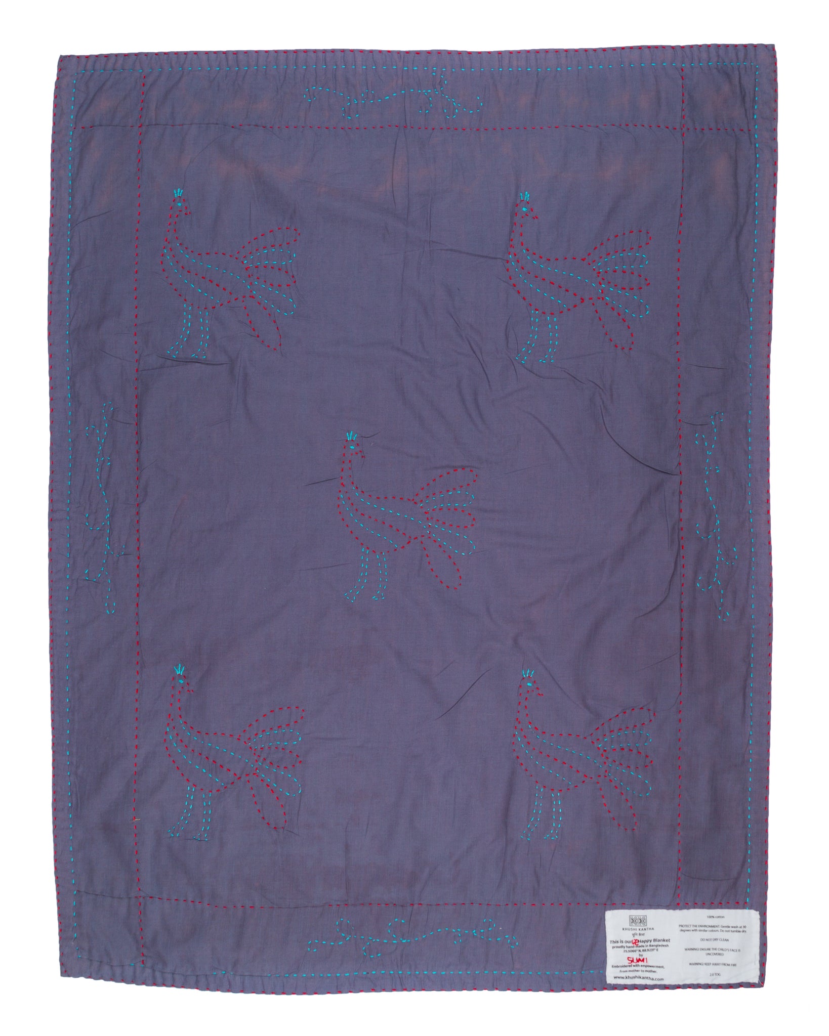 Embroidered, 100% cotton kantha baby blanket in grey and white peacock design by Khushi Kantha