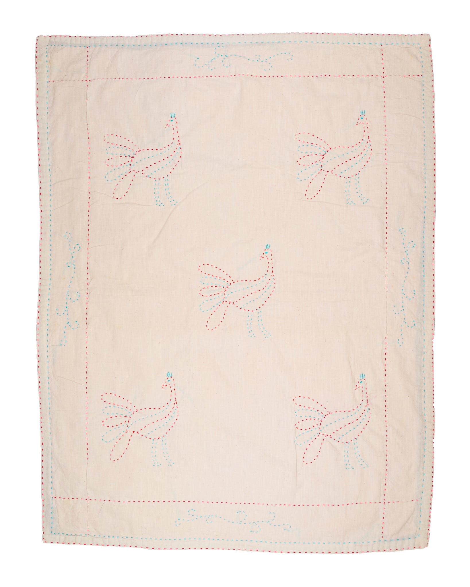 The label hand-stitched into the blanket features the geo-coordinates of the village in North-West Bangladesh where it was made, and the maker has hand-embroidered her name and the blanket’s unique number on the label.