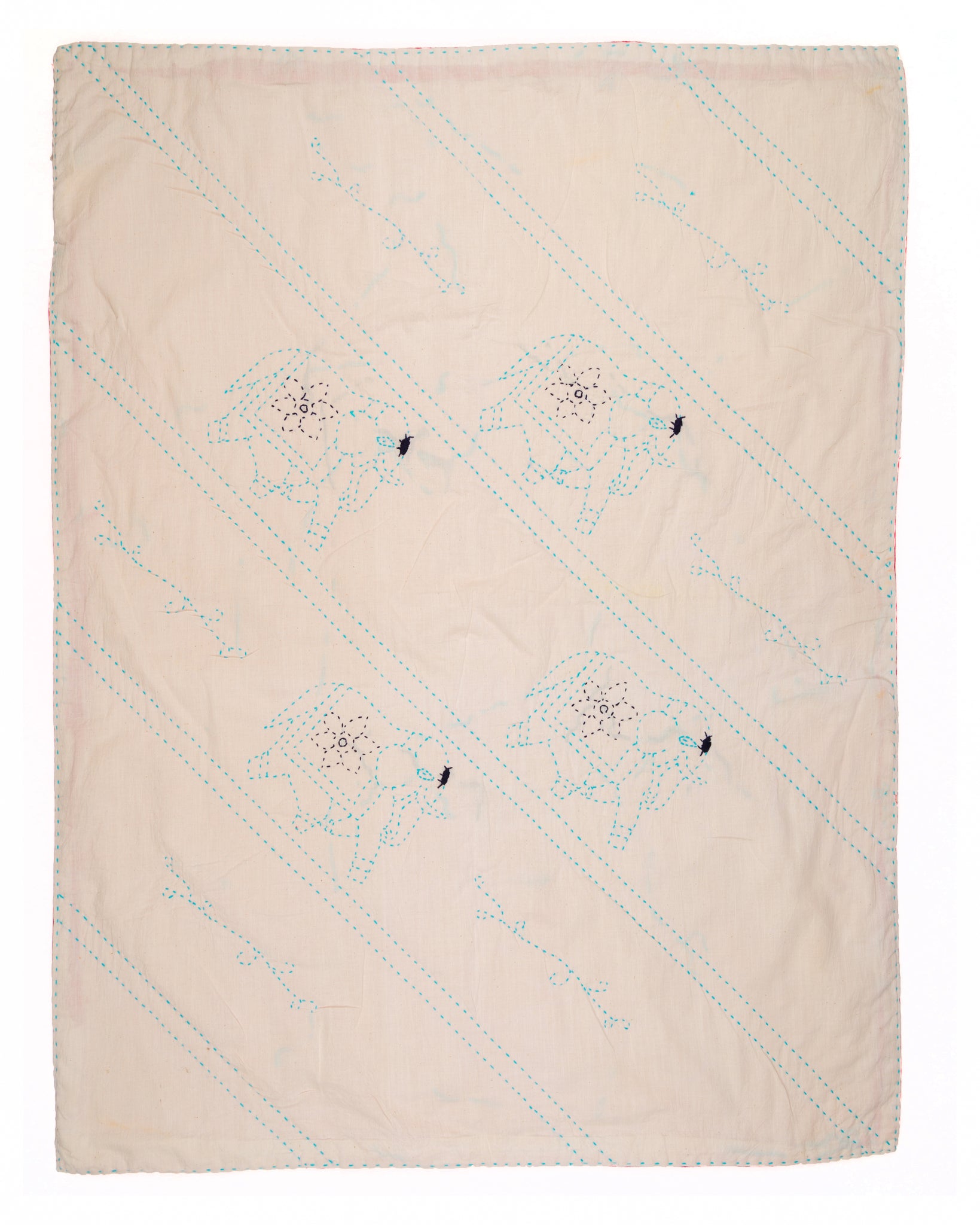 The label hand-stitched into the blanket features the geo-coordinates of the village in North-West Bangladesh where it was made, and the maker has hand-embroidered her name and the blanket’s unique number on the label.